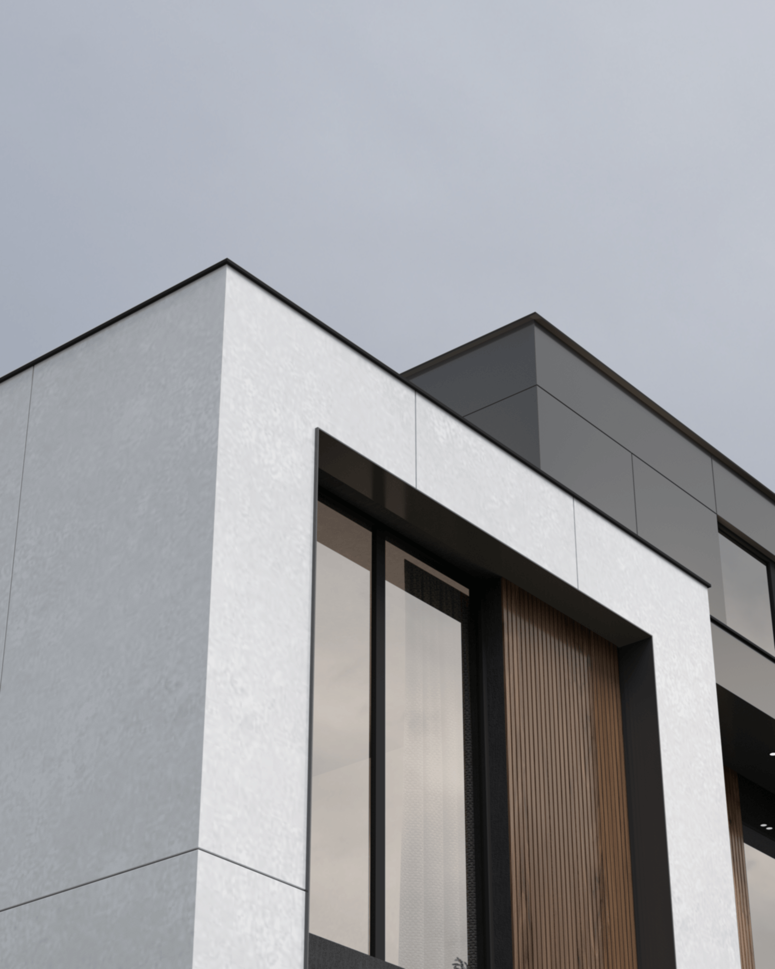 The facade of the house is modern and elegant, with a focus on clean lines and natural materials. The gray and black alucobond panels and wood accents create a modern and sophisticated look. The lighting features on the facade add to the overall aesthetic of the house and make it stand out from the surrounding buildings.