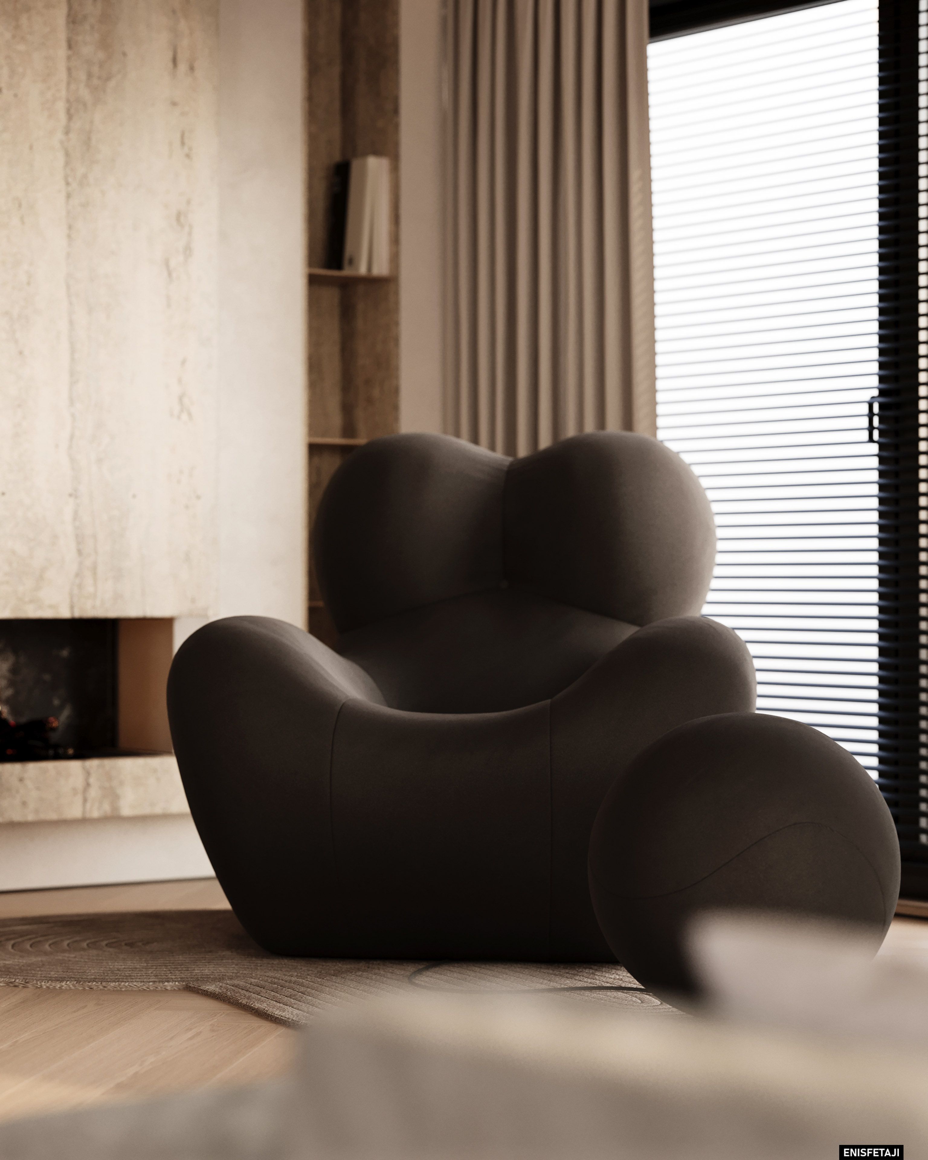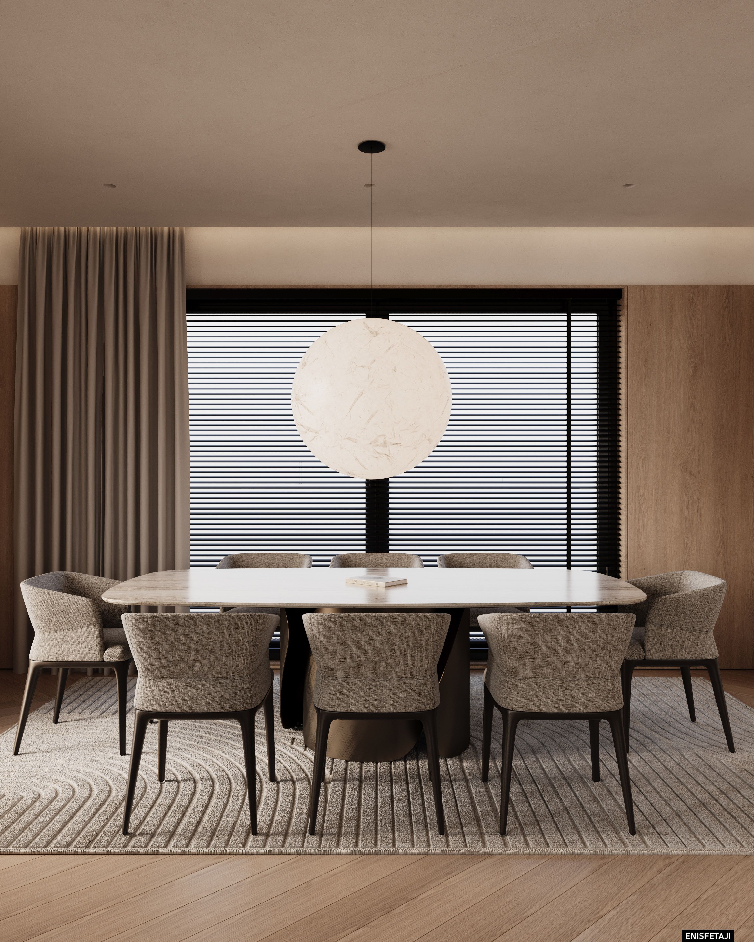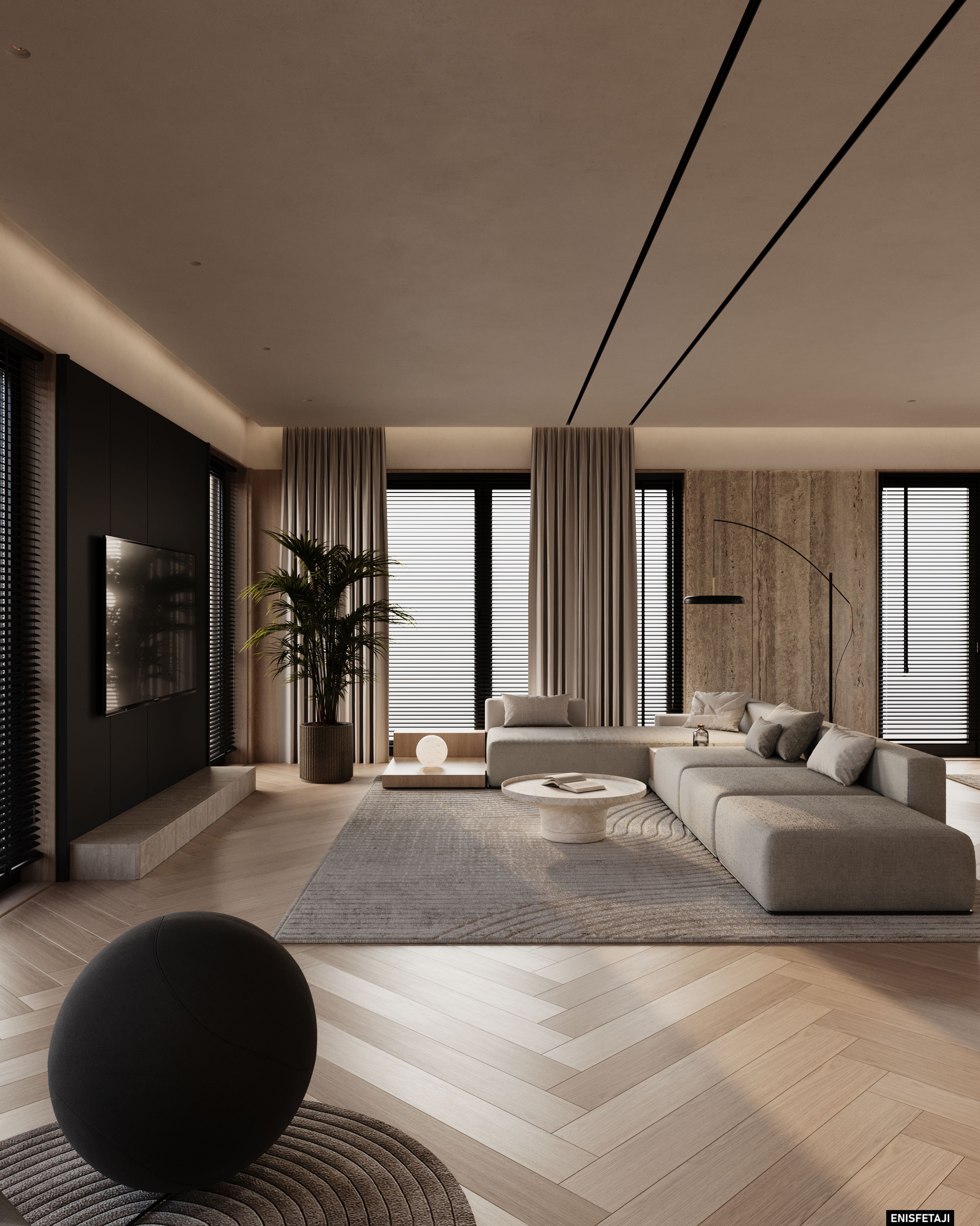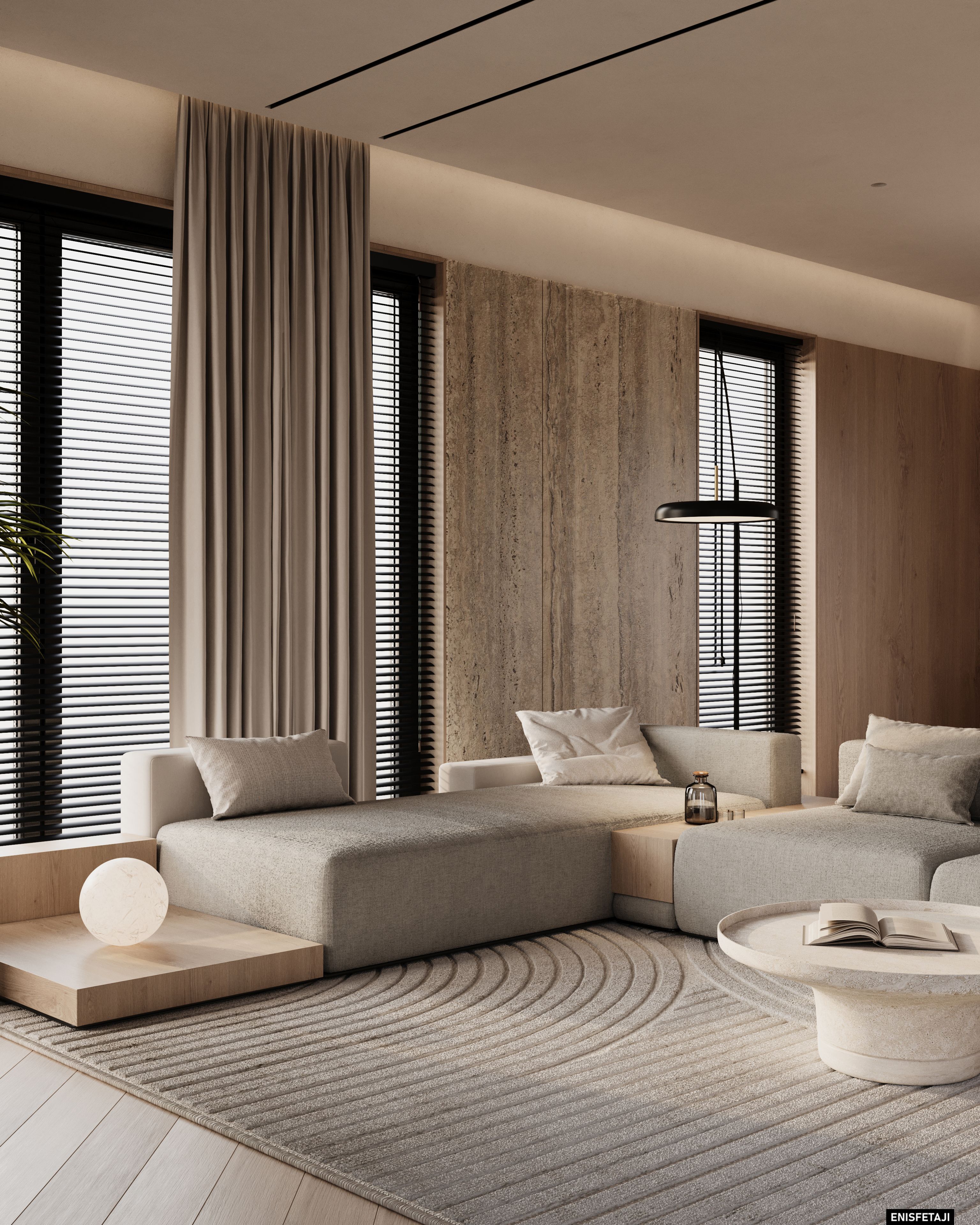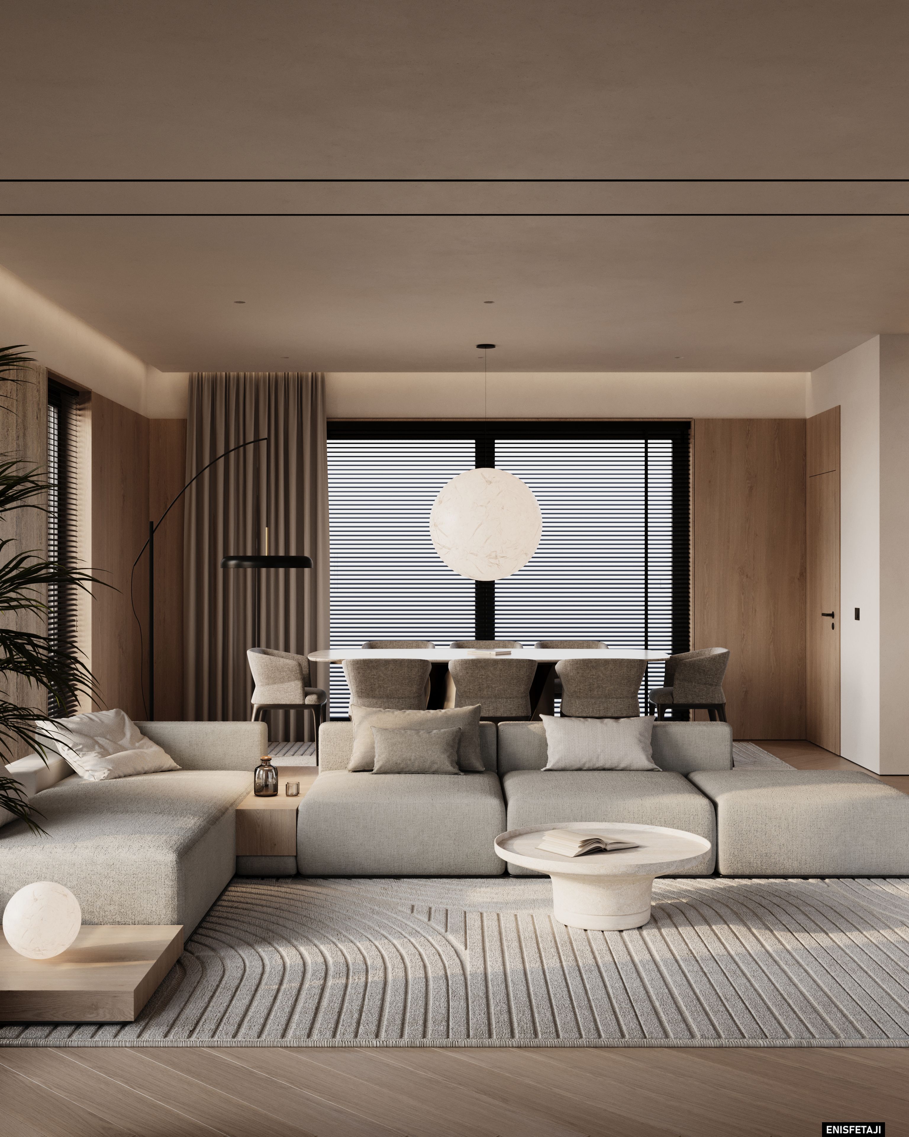 The whole idea of this kitchen-living room are designed with a simple, minimalist approach while offering a cozy ambiance with beige tones.