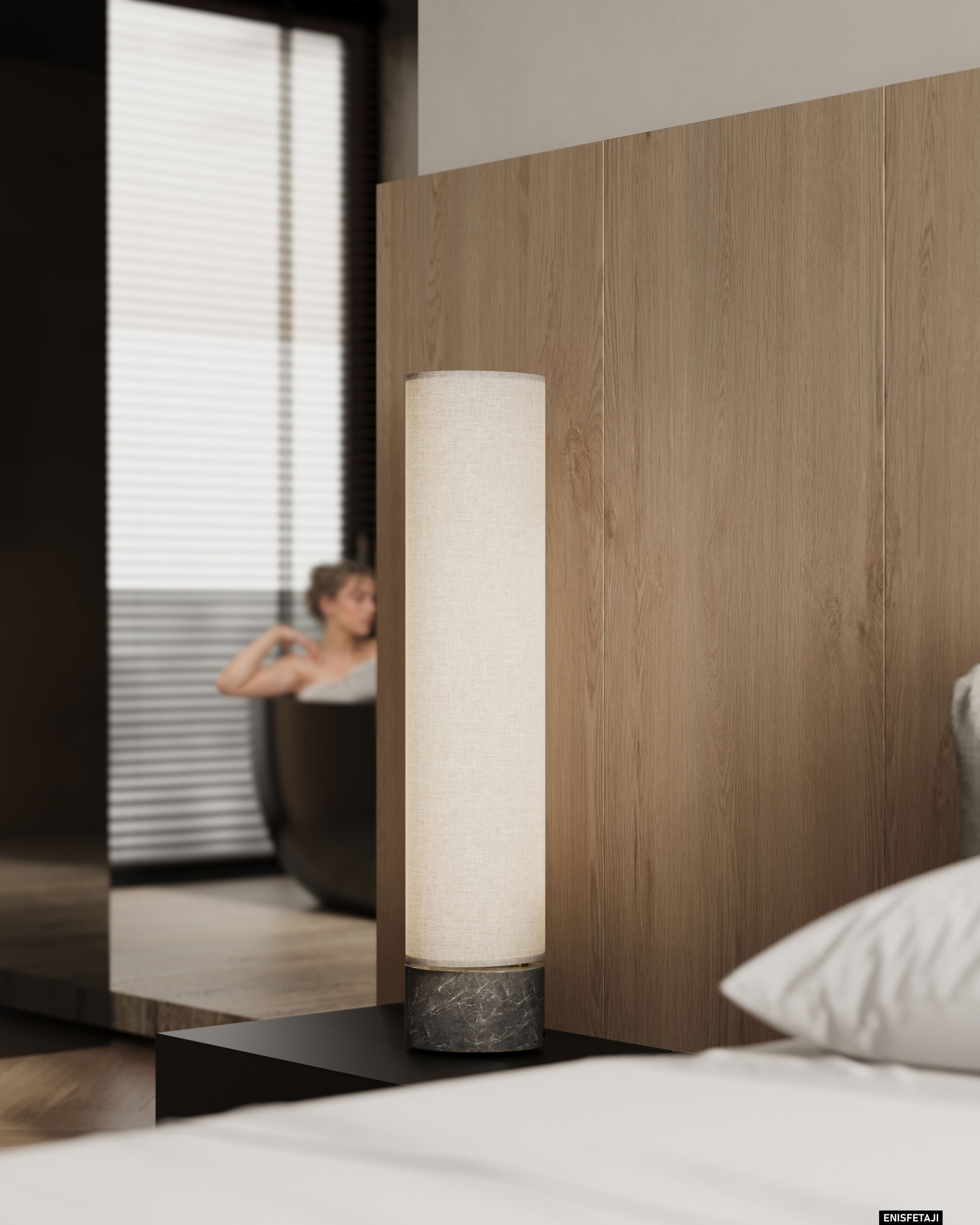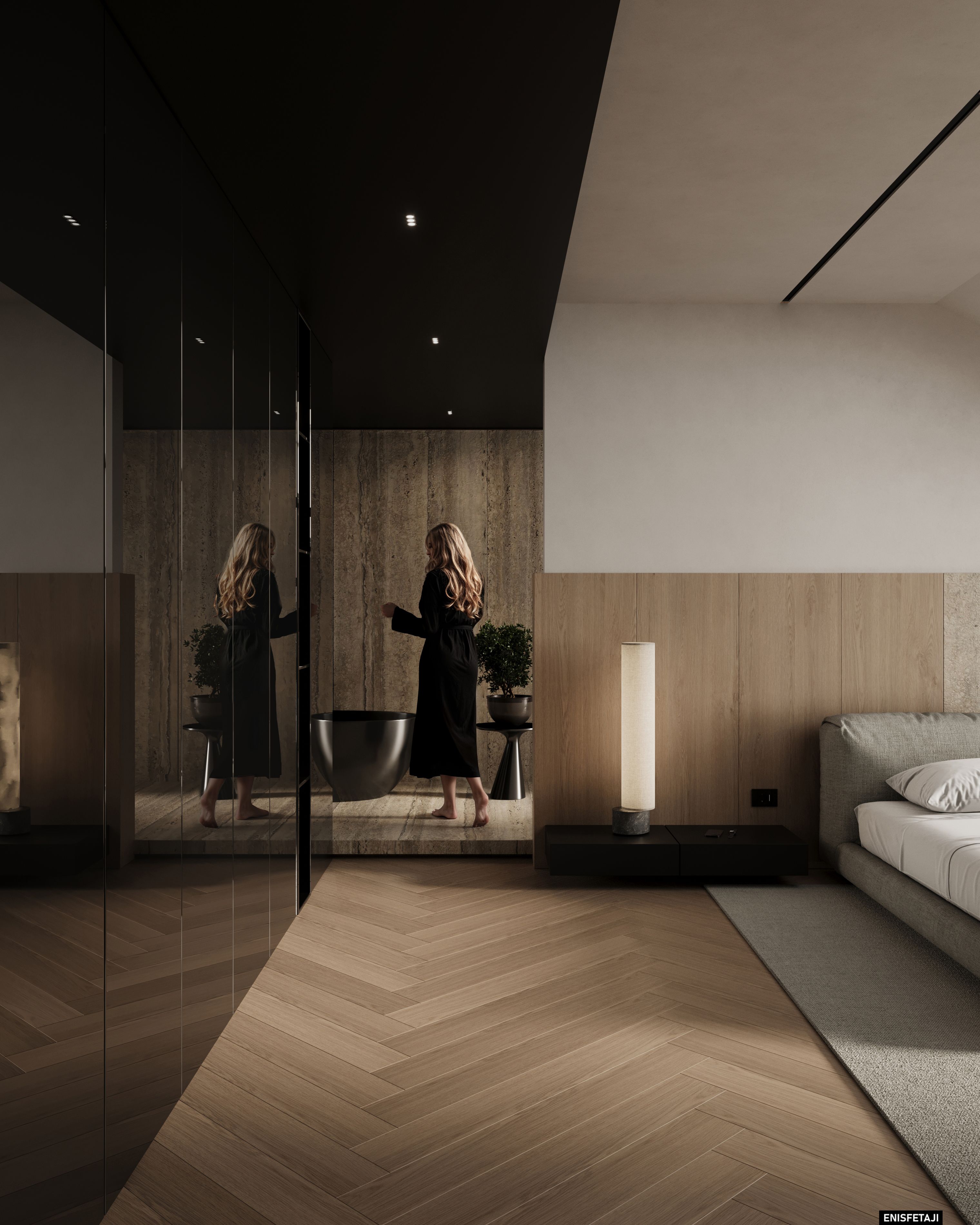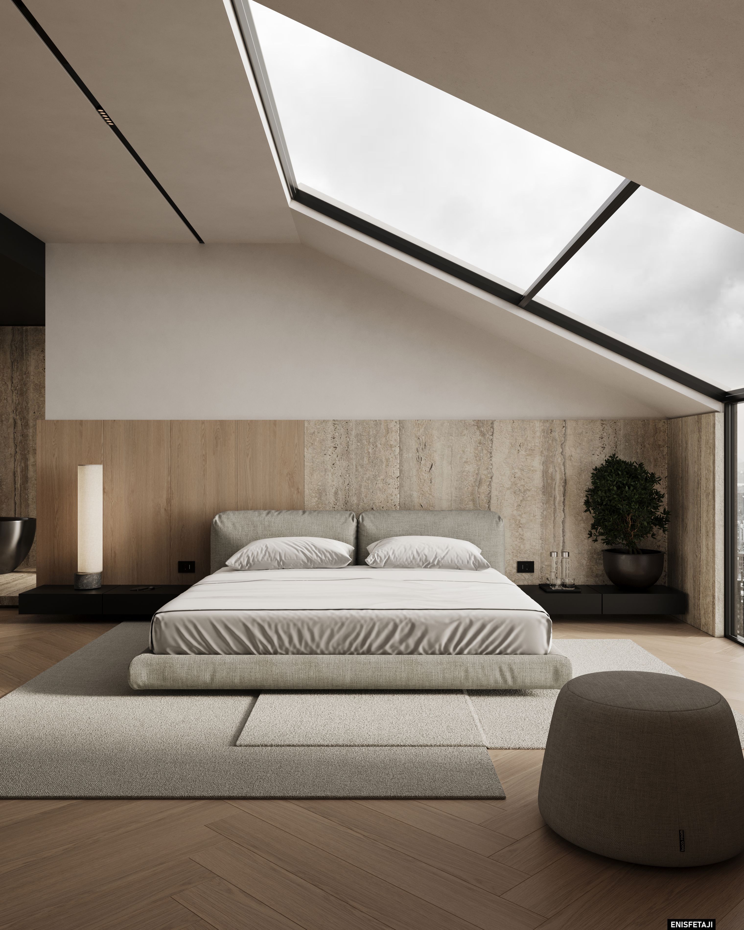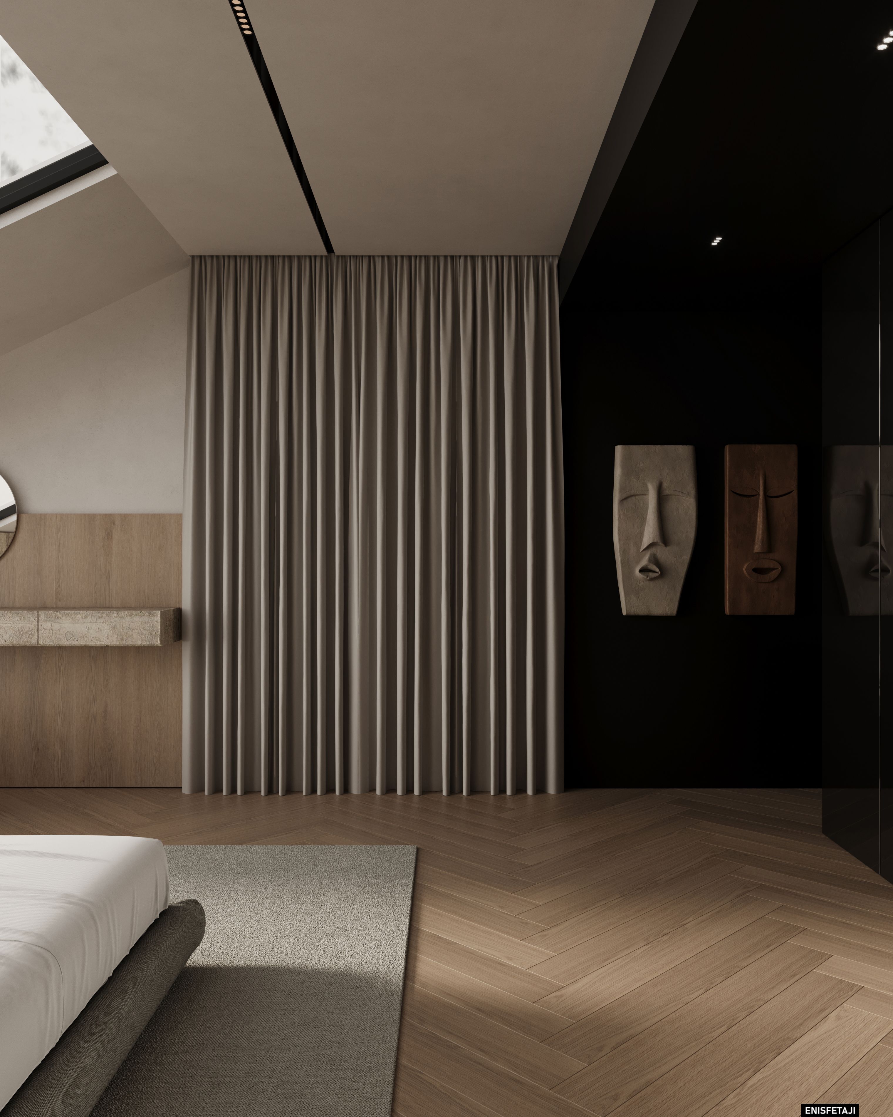 Bedroom - The ceiling was a challange duo to the roof, but now adds character. Warm wood tones, soft lighting and a sophisticated atmosphere.