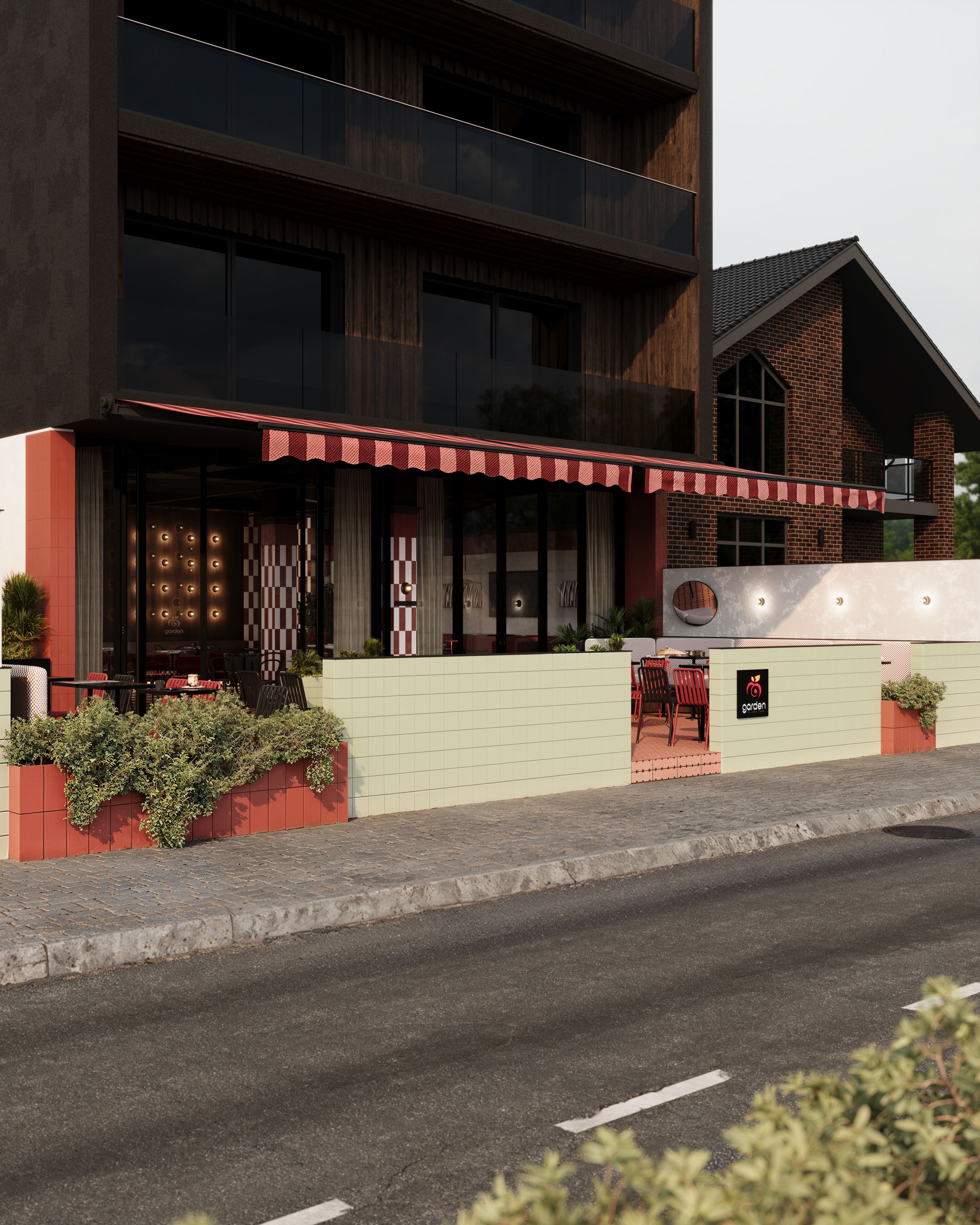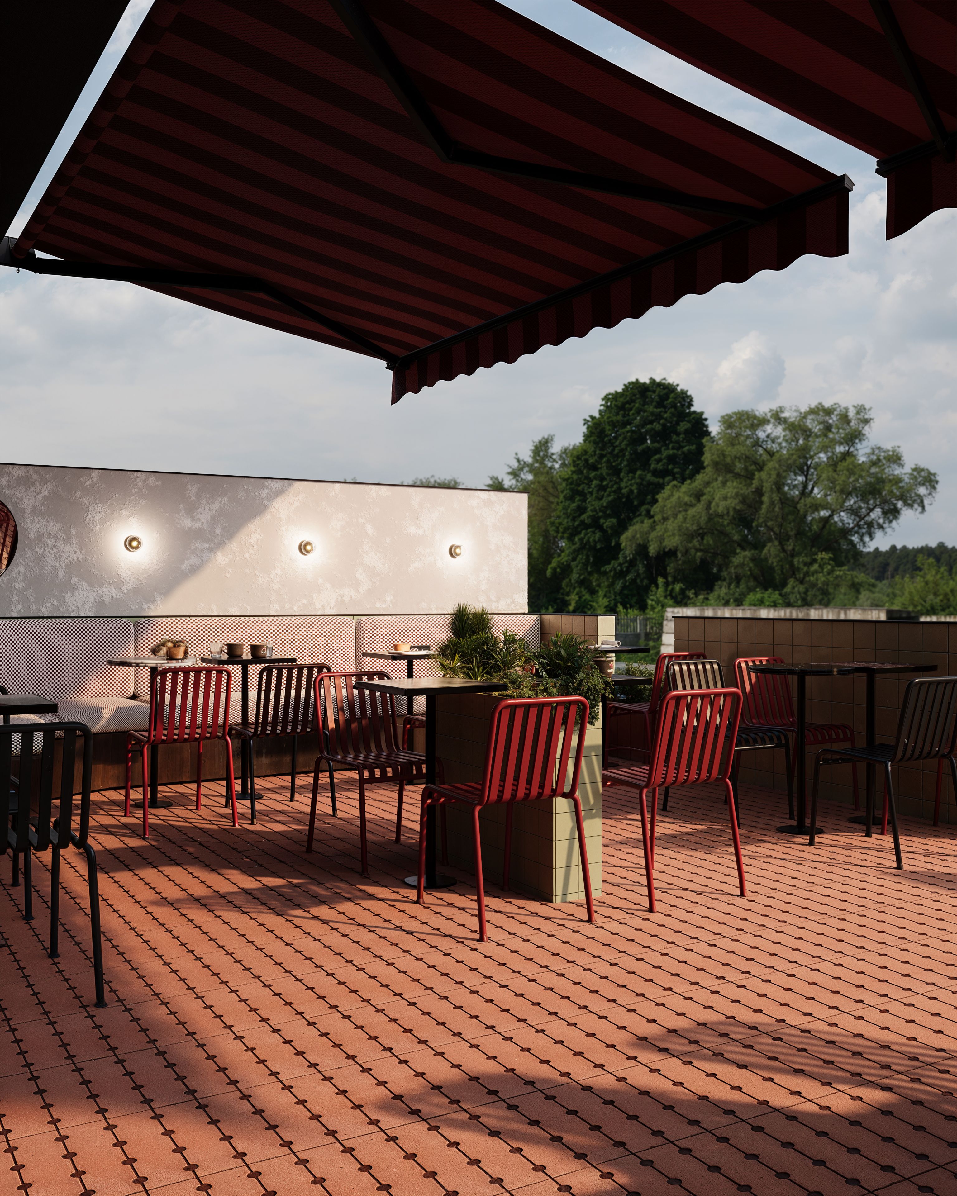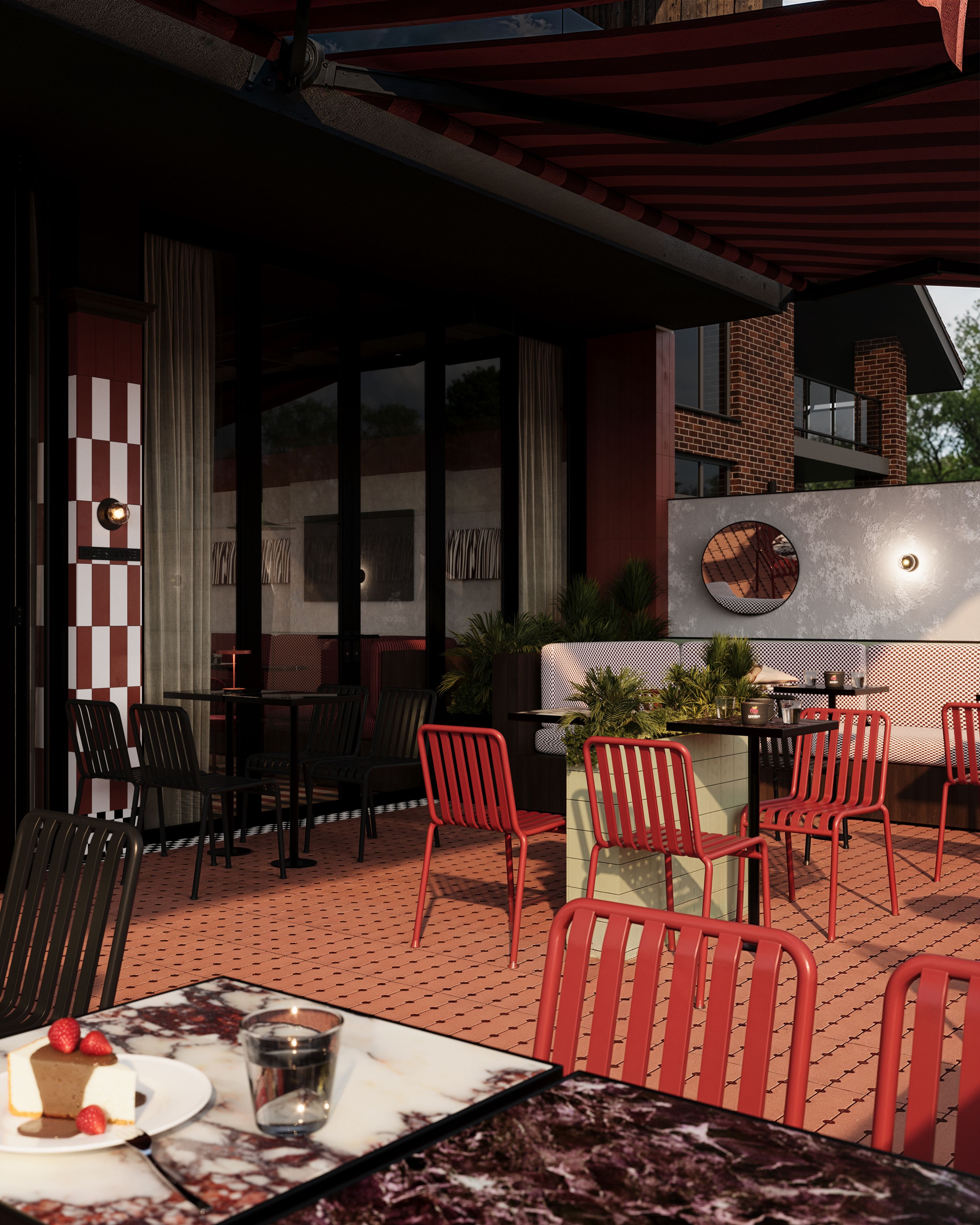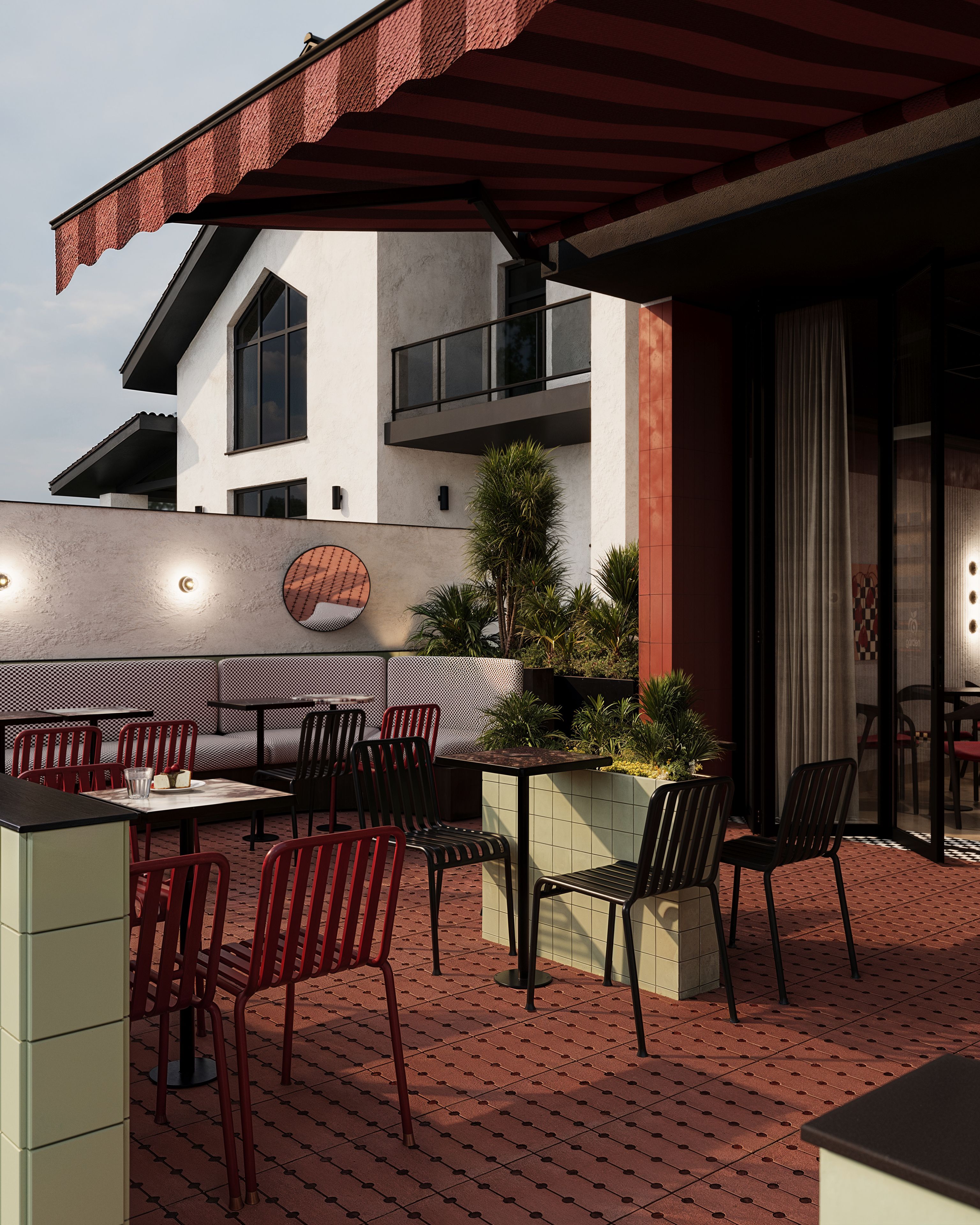 A terrace designed for colorful moments. We designed both the exterior and interior of this new spot, starting with terrace features bold red tones, patterned tiles and a mix of textures to bring energy and warmth to the space.