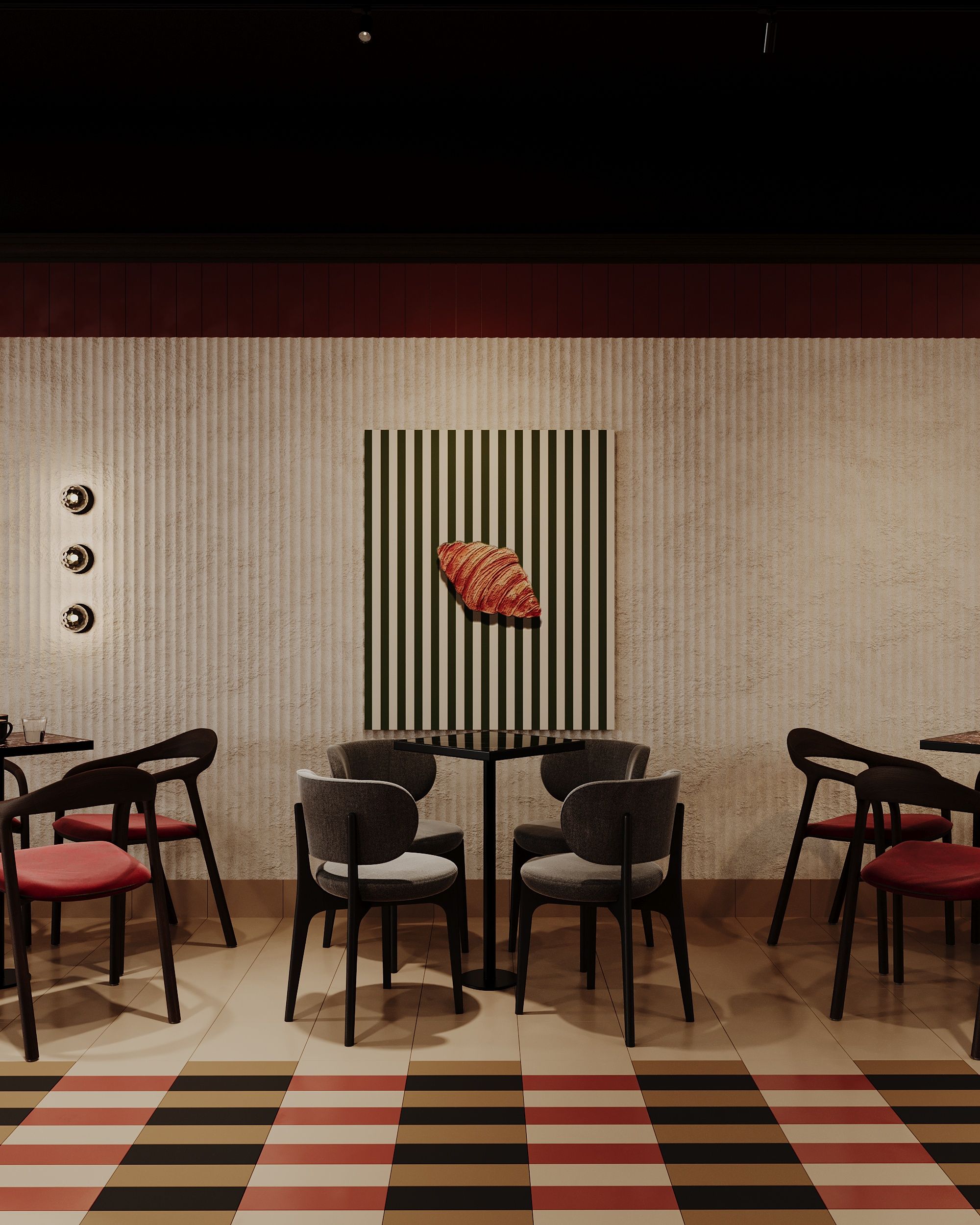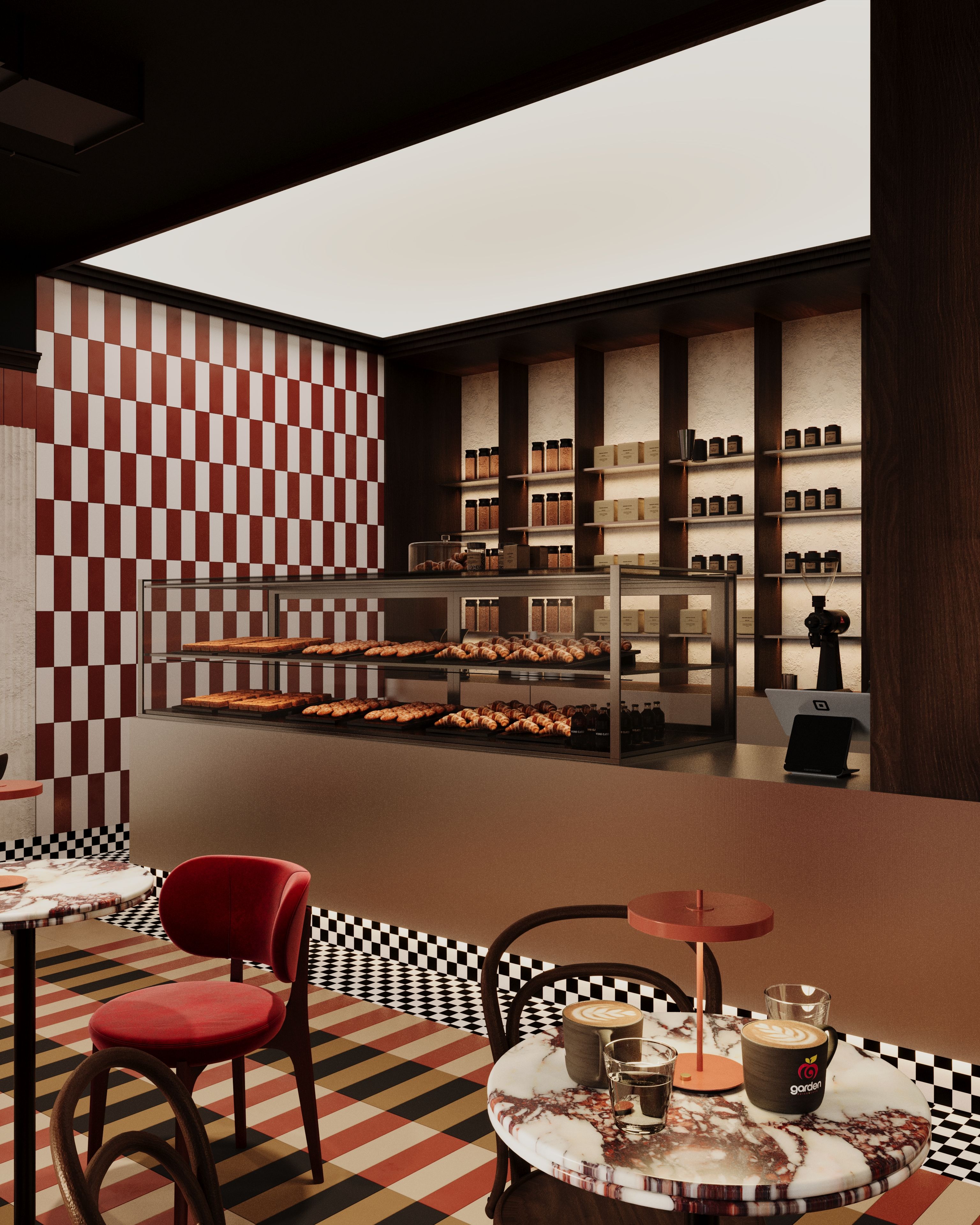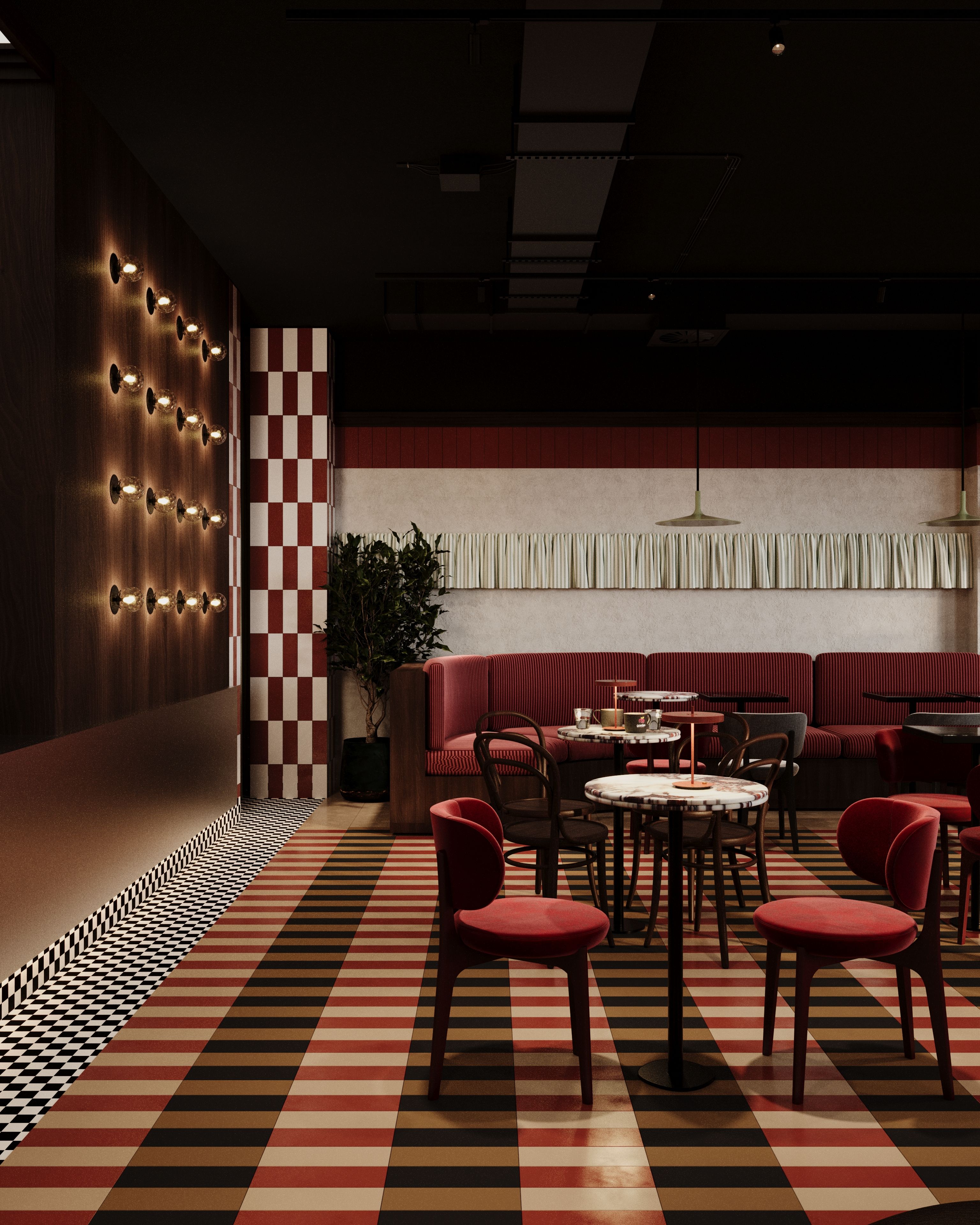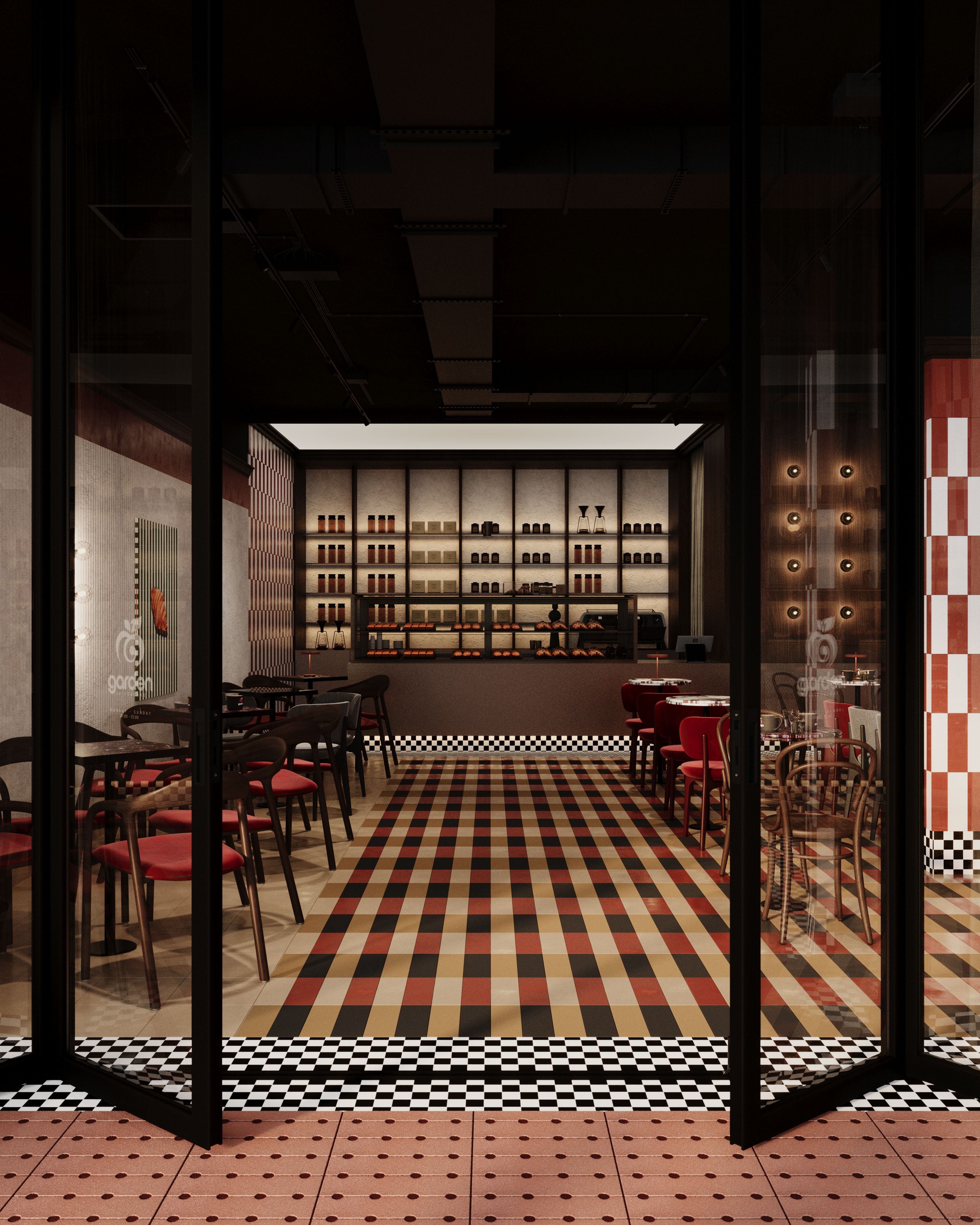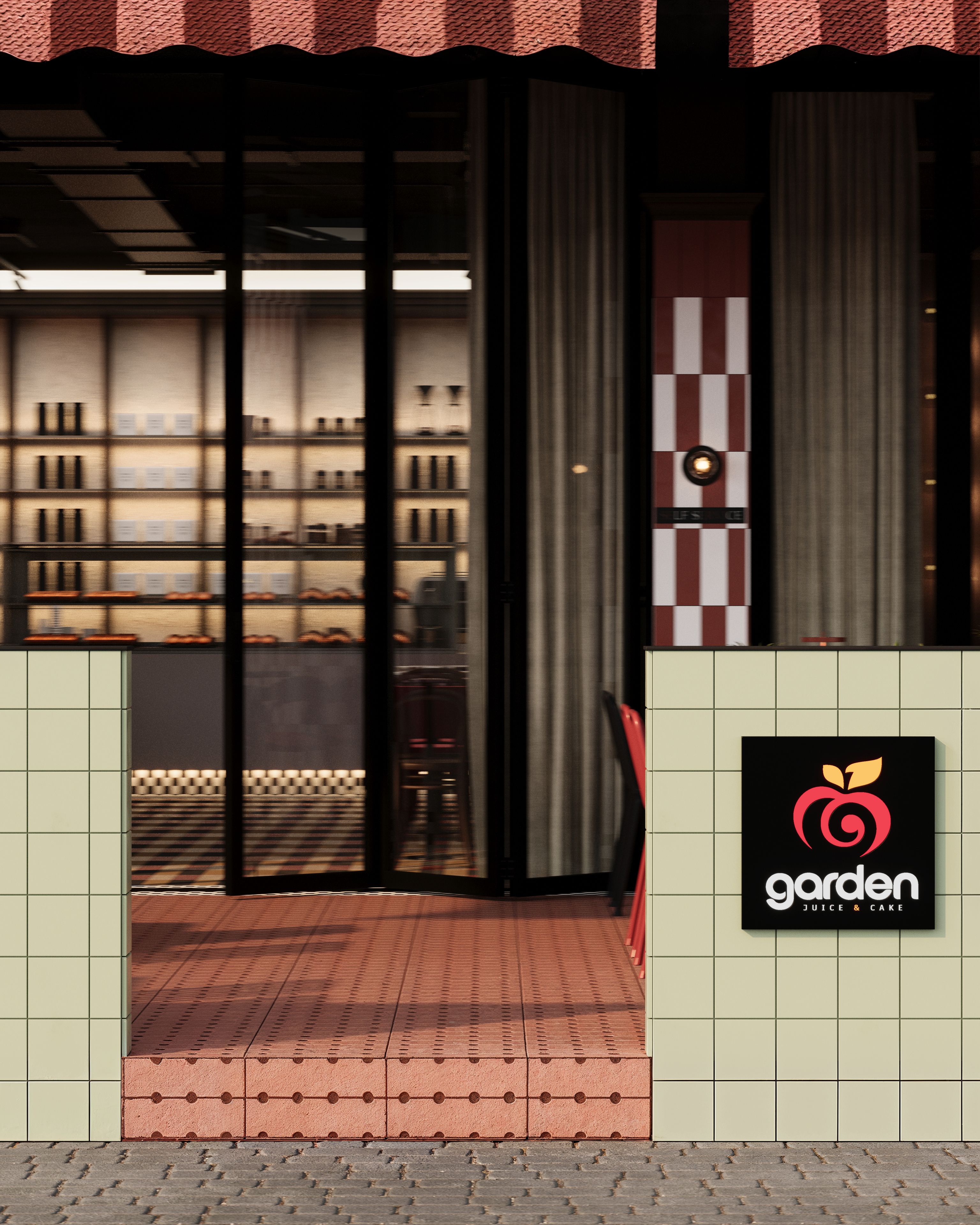 A terrace designed for colorful moments. We designed both the exterior and interior of this new spot, starting with terrace features bold red tones, patterned tiles and a mix of textures to bring energy and warmth to the space.