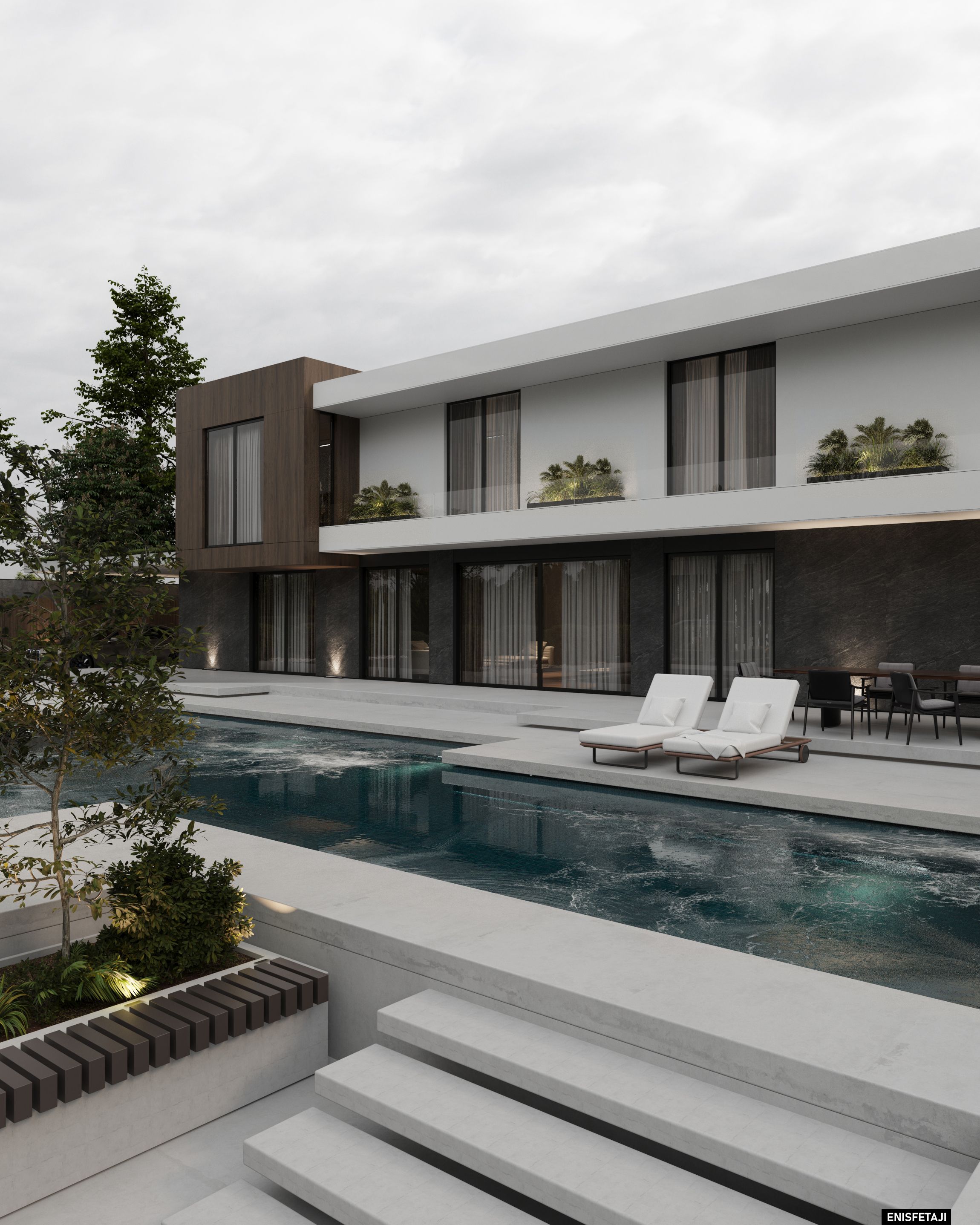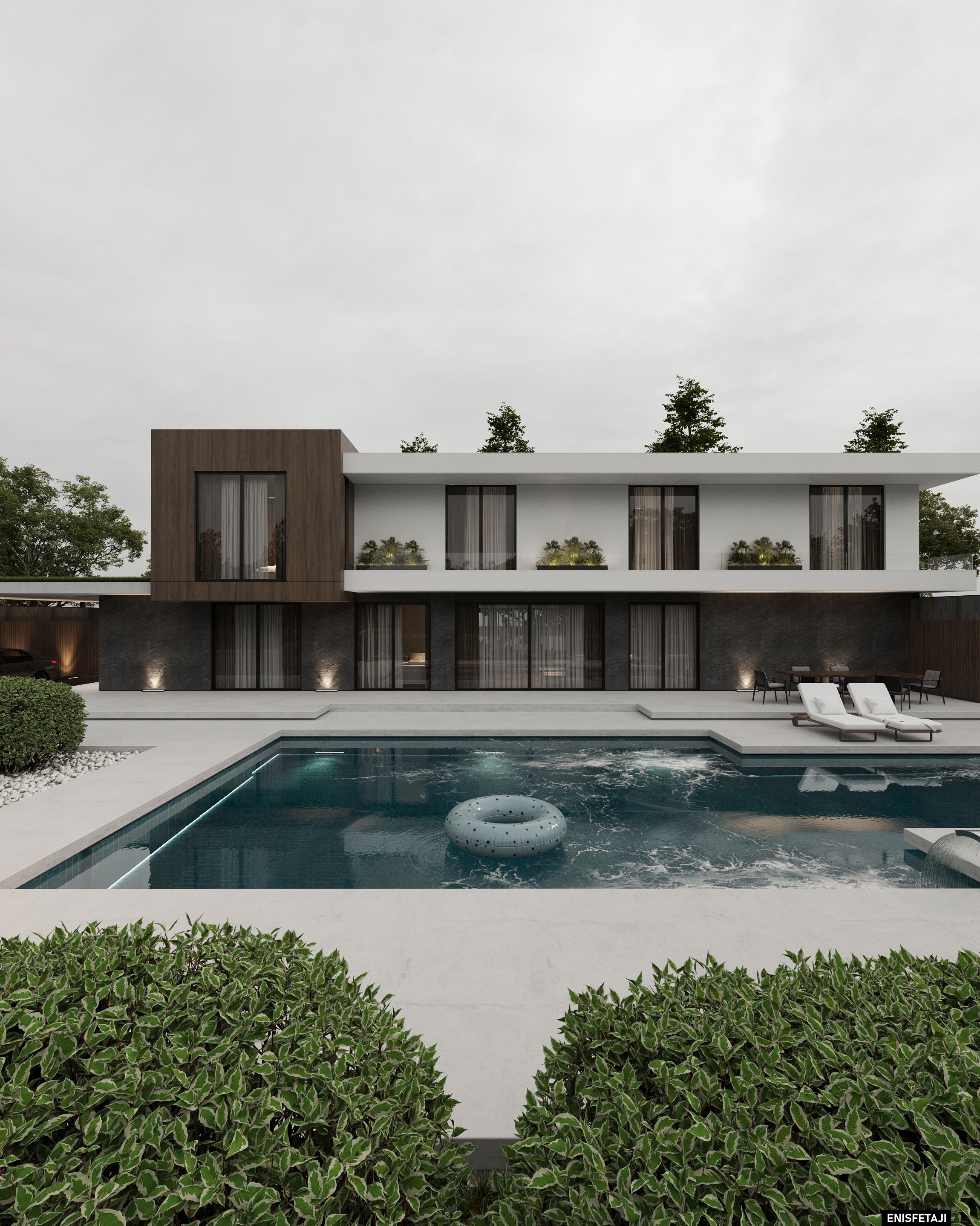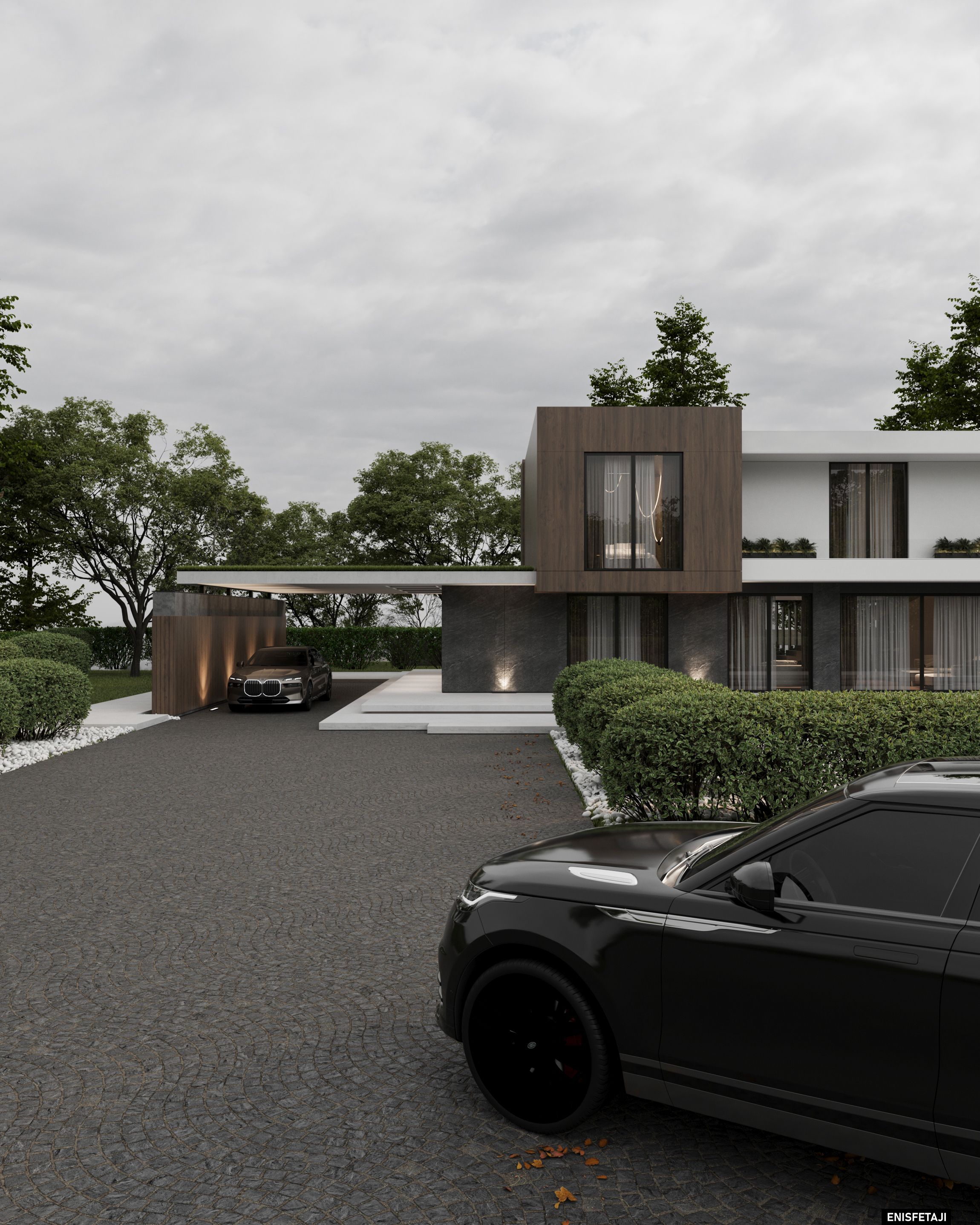 our stunning modern villa project, where sleek architecture meets elegance. The villa features an amazing facade, blending pristine white, chic anthracite, and natural wood elements. This harmonious design creates a contemporary yet warm and inviting aesthetic, perfect for modern living.