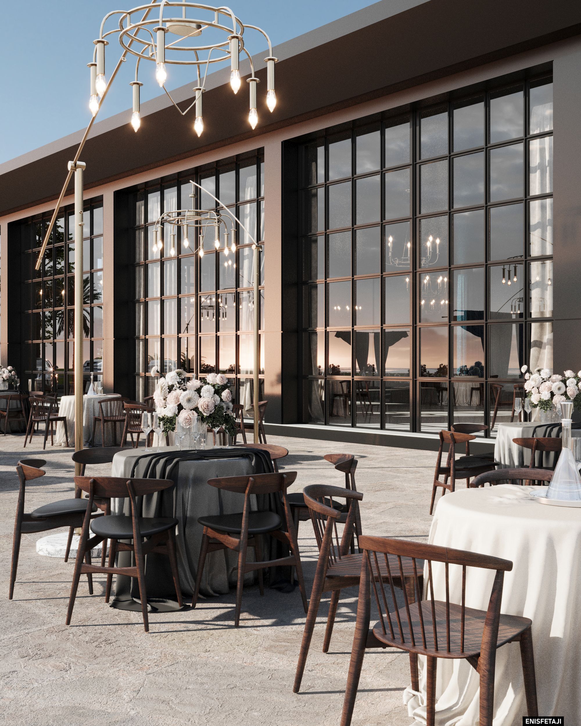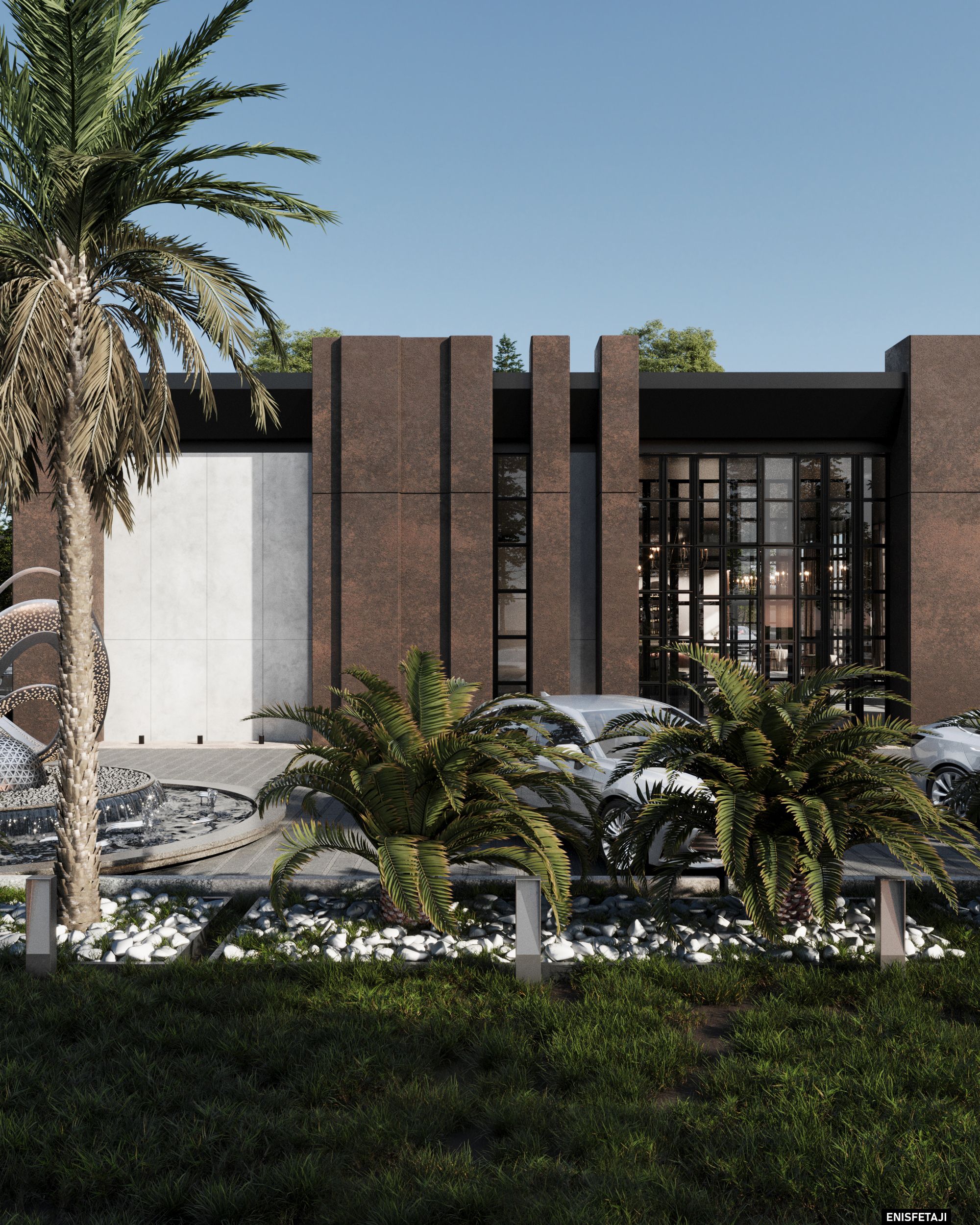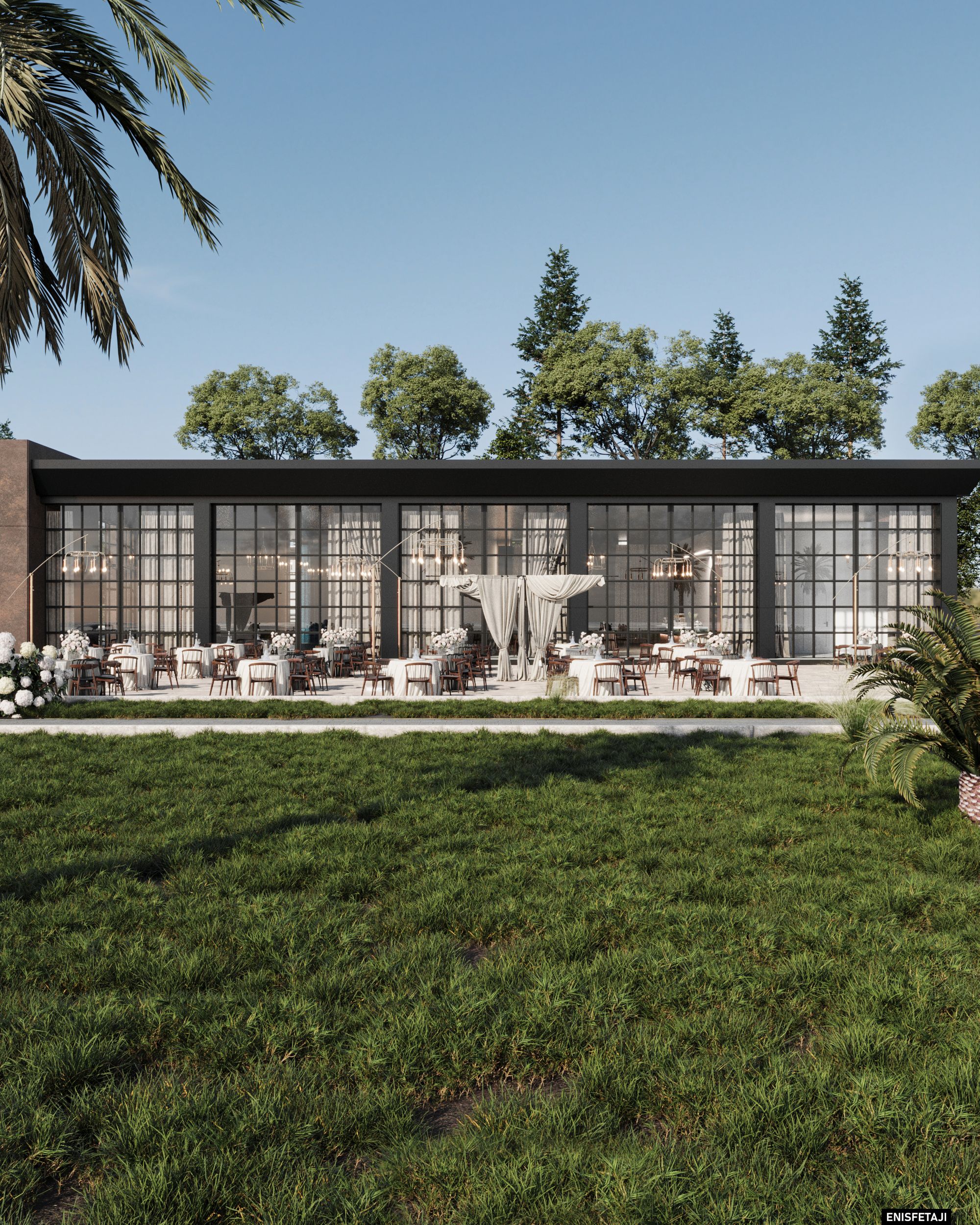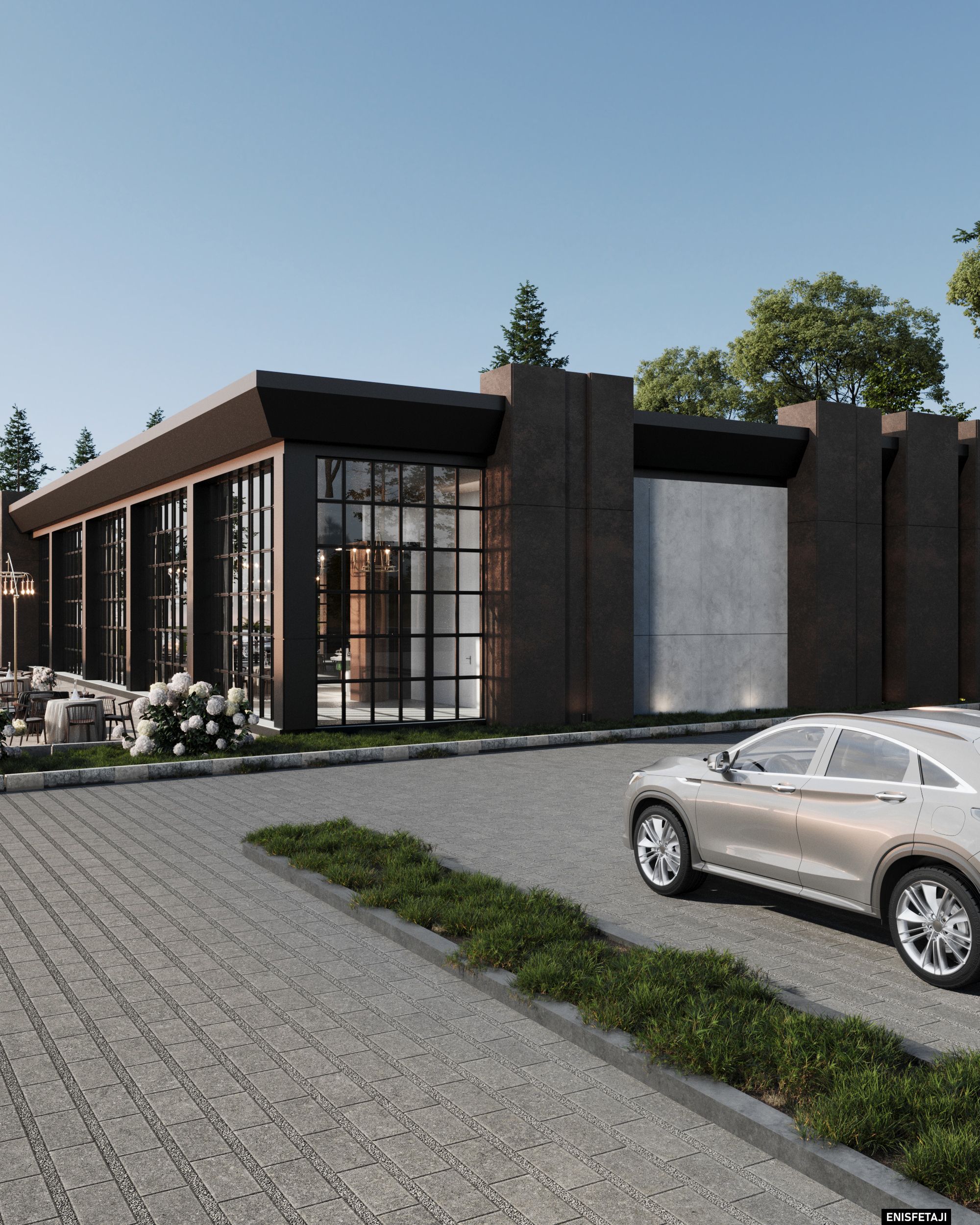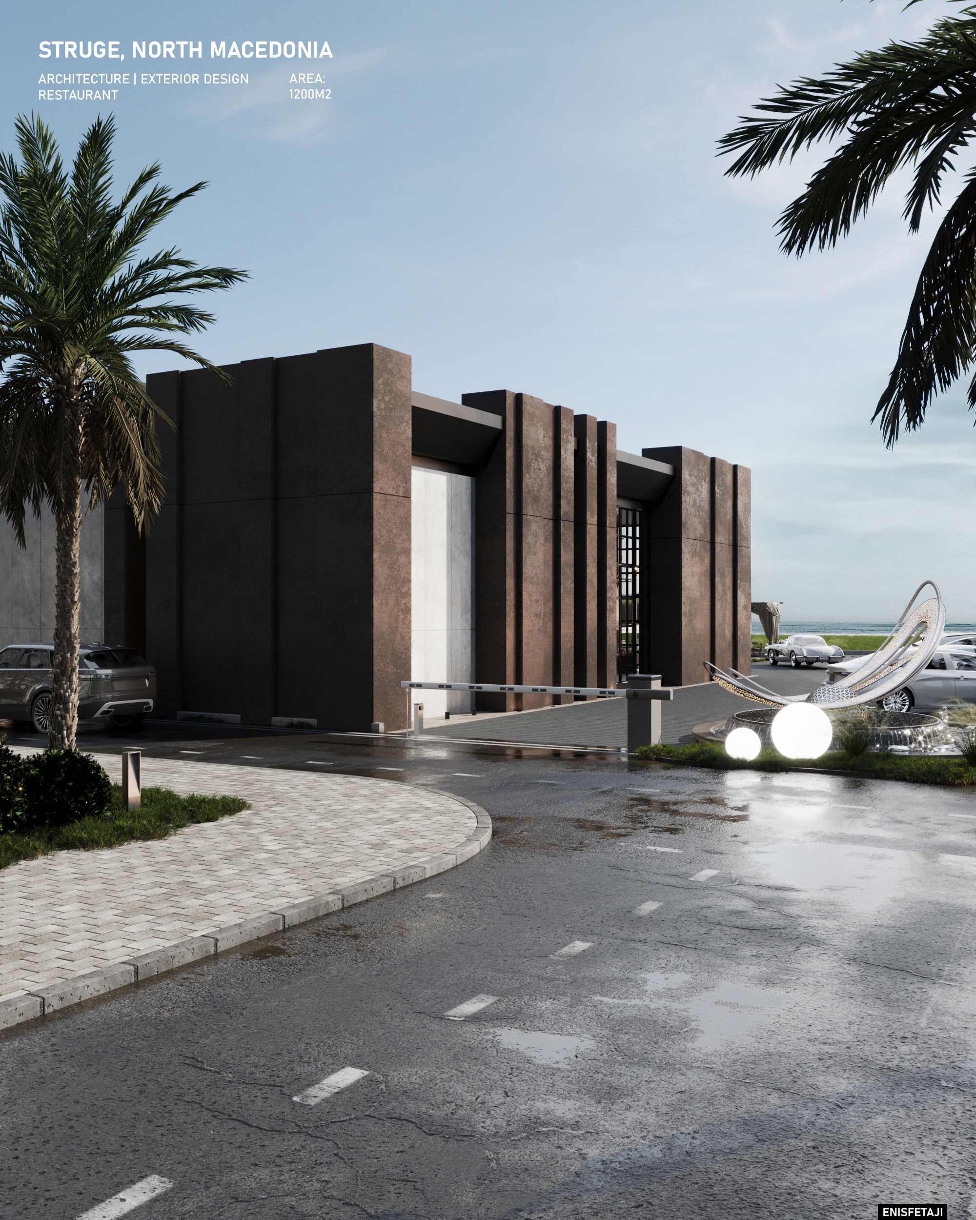 restaurant design in Struga that features a contemporary architecture with clean lines and natural materials. An organic structure made by rusted steel. Large openings and a spacious tetrace offer breathtaking views of the lake.