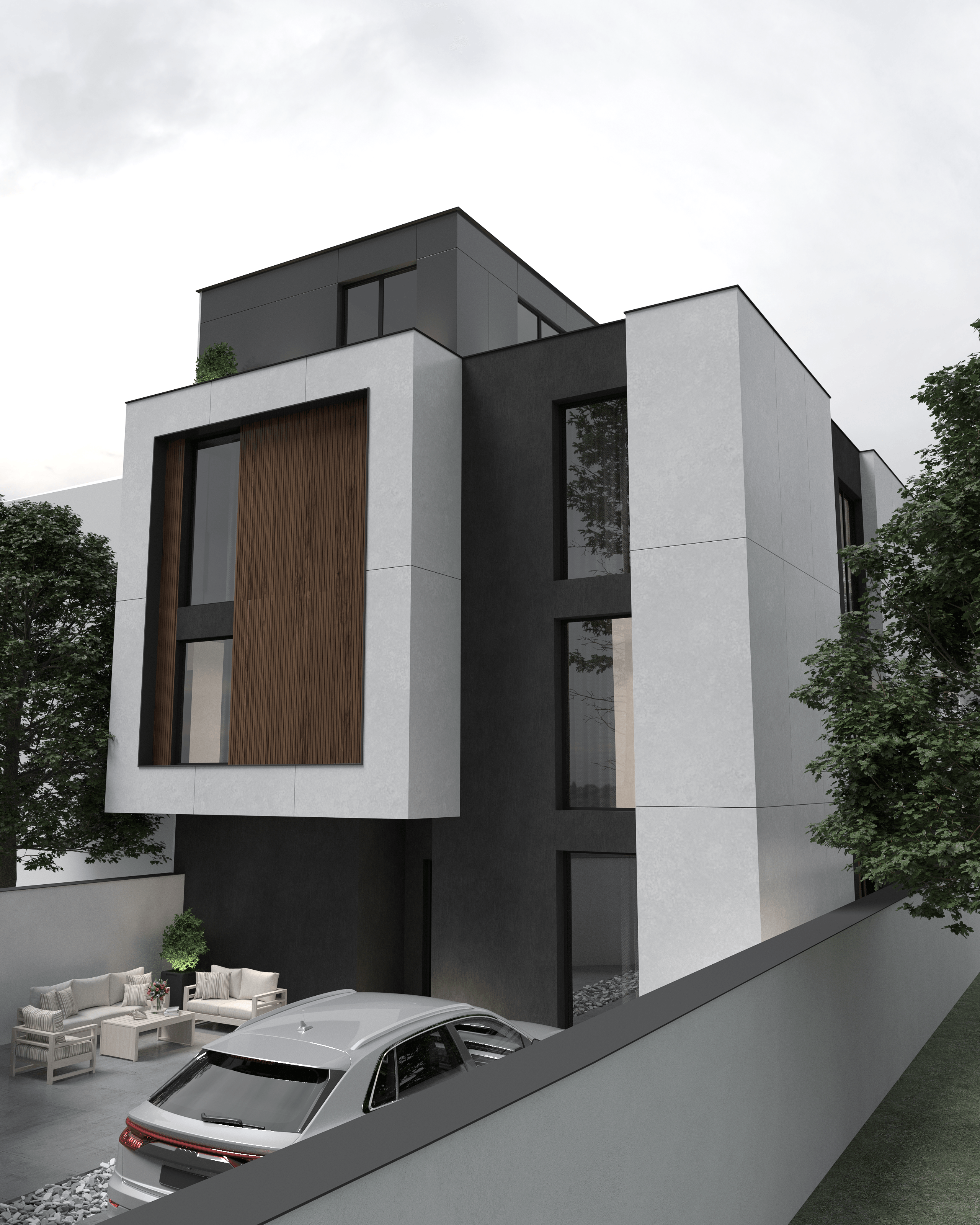 The most difficult challenge in designing this house was the limited plot size. The house is located next to another house, so it was important to design a house that was functional and aesthetically pleasing, while also respecting the privacy of the neighbors. To overcome this challenge, we used a vertical layout for the house, with three stories. This allowed for a spacious and comfortable home on a small footprint.