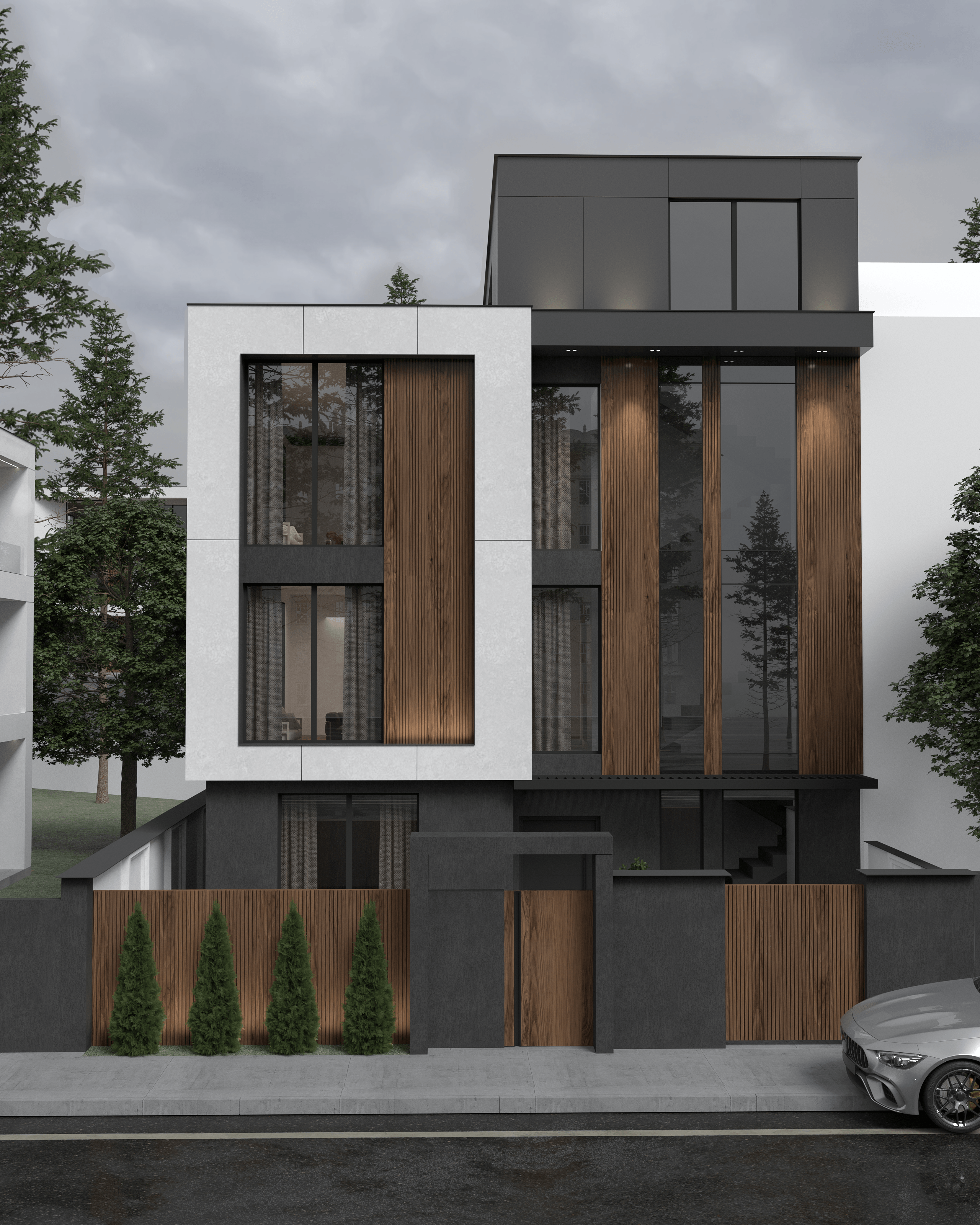 The facade of the house is modern and elegant, with a focus on clean lines and natural materials. The gray and black alucobond panels and wood accents create a modern and sophisticated look. The lighting features on the facade add to the overall aesthetic of the house and make it stand out from the surrounding buildings.